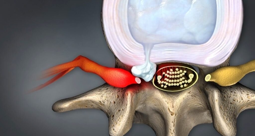 A dor da hérnia de disco ocorre porque o material interno do disco — chamado núcleo pulposo — escapa e irrita as raízes nervosas. Quando isso acontece, o paciente pode sentir dor que “desce” para a perna (ciatalgia), ou para o braço, no caso da região cervical. Quanto maior a compressão, maiores tendem a ser os sintomas neurológicos.